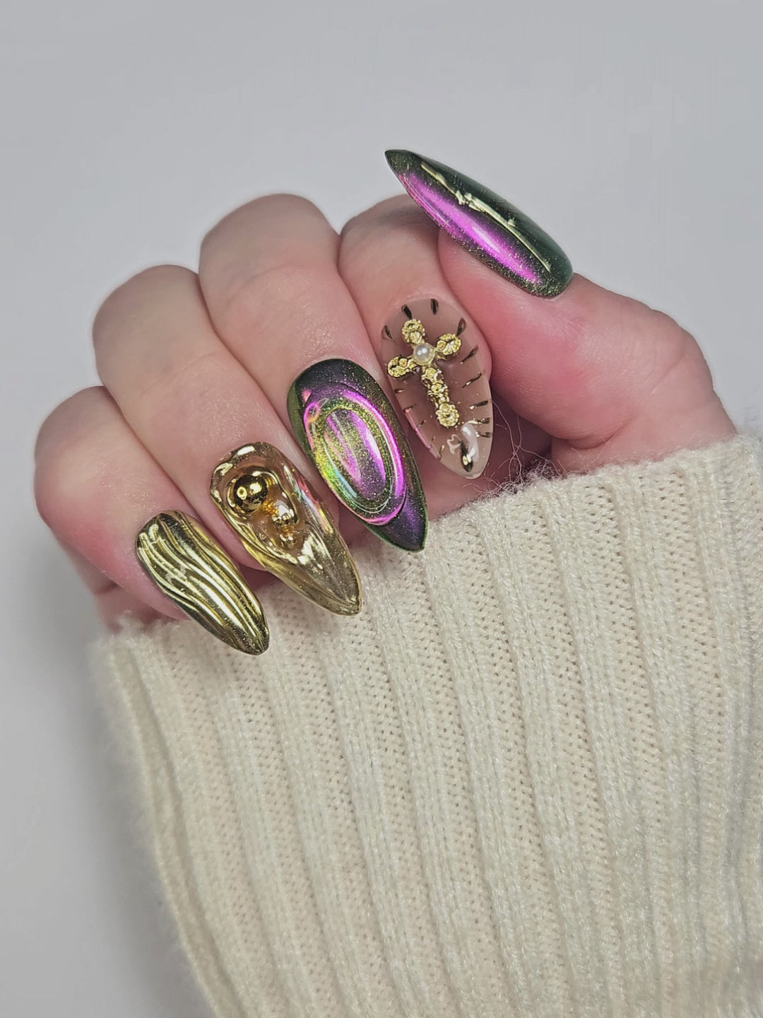 Galactic Treasure er til dig, der elsker dramatiske negle, hvor hver bevægelse afslører nye detaljer – en kombination af kosmisk mystik og ren guldglans.